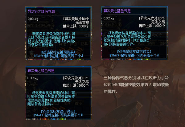 三種異界氣息分別可以在攻擊力,冷卻時(shí)間和增強(qiáng)技能效果方面增加裝備的屬性。