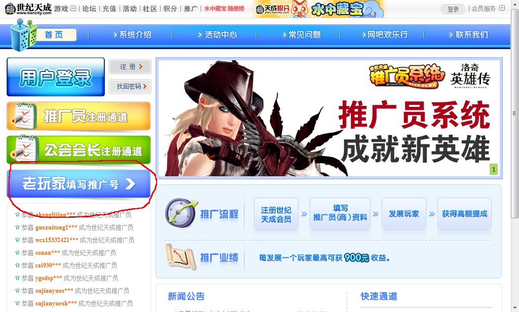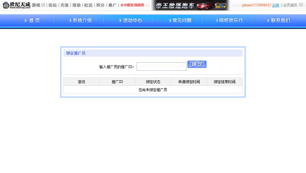 注意:當(dāng)你的賬號(hào)填寫(xiě)推廣員ID后,3個(gè)月內(nèi)進(jìn)行充值,推廣員ID賬號(hào)中將獲得由世紀(jì)天成發(fā)放的3%提成。綁定推廣員ID24小時(shí)后,請(qǐng)登錄此地址http://pay.tiancity.com/webcoupon/index2.html后點(diǎn)擊此處
