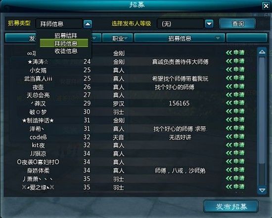 3、選擇“我要拜師”或者“我要收徒”輸入相關(guān)招募信息即可。你也可以選擇右上角的“查詢”按鈕,直接查詢已有招募信息,進(jìn)行拜師、收徒相關(guān)操作。
