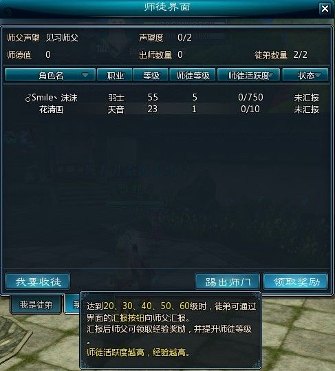 師父帶徒弟擊殺副本活動中的怪物可獲得師徒活躍度,每擊殺一個怪物可獲得10點(diǎn)師徒活躍度,當(dāng)徒弟角色等級到達(dá)20、30、40、50、60時,可通過“我是徒弟”界面下的匯報(bào)按鈕像師父匯報(bào)。