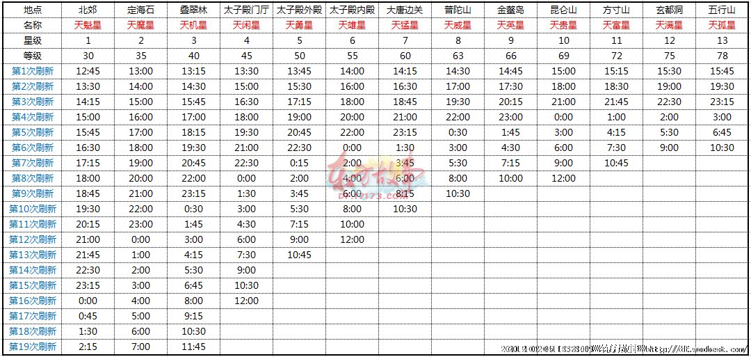 刷新因該是從這個表上的最后一次刷新開始你就要自己計算的。每個星都有他的刷新間隔時間,星的等級越高,所需要的間隔時間也就越長。