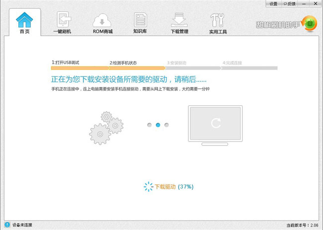 二、下載完成,打開甜椒刷機助手,手機通過USB連接上電腦,按照甜椒刷機助手的提示,在手機上開啟USB調(diào)試。開啟了USB調(diào)試功能,甜椒刷機助手會自動下載并安裝驅動。