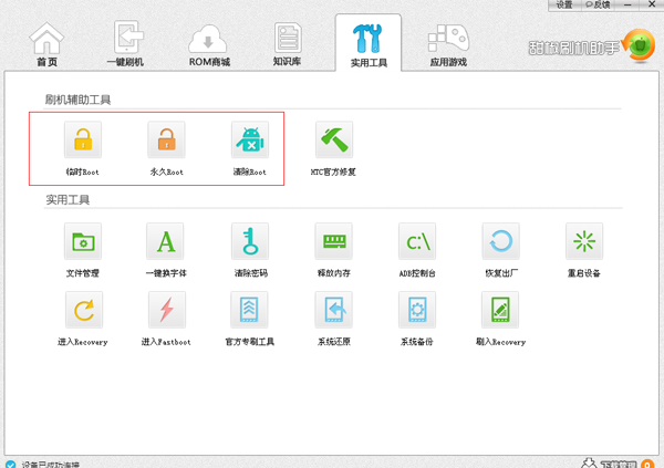 三、驅動安裝完成了,連接上的手機后,先要備份好手機的信息和聯(lián)系人,再檢查手機是否ROOT了,只有ROOT后才可以刷機,如果沒有ROOT,可以打開實用工具,點擊臨時ROOT或者永久ROOT,遇到ROOT失敗,可以試試多次就有可能成功了。