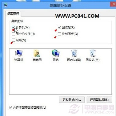 三、點擊“更改桌面圖標(biāo)”設(shè)置后會彈出“桌面圖標(biāo)設(shè)置”對話框,這里就可以看出問題了,由于系統(tǒng)安裝后,為了桌面的簡潔,默認(rèn)沒有勾選上“計算機”、“回收站”等等網(wǎng)絡(luò)圖標(biāo)在桌面顯示,因此才會出現(xiàn)Win8桌面圖標(biāo)不見了的情況,因此我們只需要勾選上自己需要在桌面顯示的圖標(biāo)即可,如下圖:
