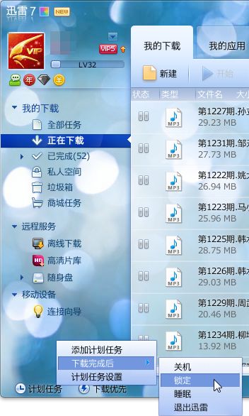 另外,新版本的迅雷7在下載完成后,除了原來僅支持“下載完成后關(guān)機(jī)”,現(xiàn)在增加了“關(guān)機(jī)、待機(jī)(XP)、鎖定、睡眠、退出迅雷”等選項(xiàng)(如圖4),使得操作更為豐富和靈活。