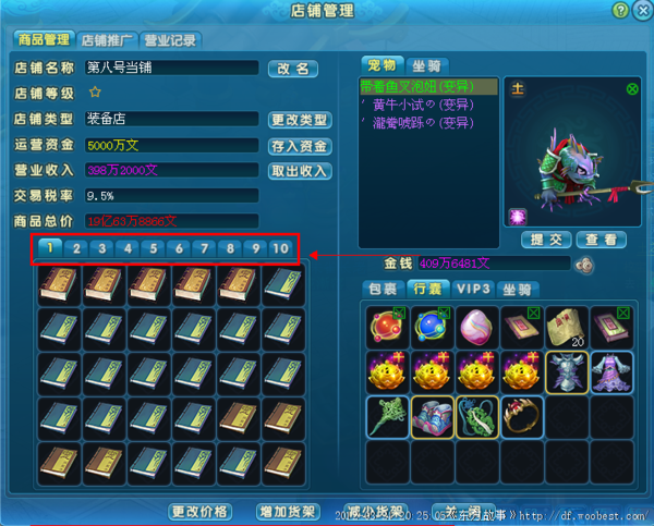 3、新開的店鋪默認(rèn)只有1個貨架,可以上架30件商品,包括物品、寵物和坐騎。如果覺得格子不夠,可以增加貨架,每次可以增加1個貨架,最多可以增加到10個貨架,上架300件商品(每增加1個貨架需要消耗100W游戲幣且增加一定量的運營資金,同時每天需要扣除的運營資金量增加);