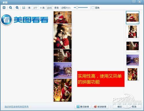 在軟件主界面右方選擇原圖片,單擊右下角“拼圖”按鈕,即可進(jìn)入如圖02所示拼圖功能窗口。美圖看看提供了幾個相對實(shí)用的編輯選項(xiàng),比如再添加其他照片進(jìn)來、定義拼圖尺寸大小和邊框大小等;最重要的是,通過美圖看看還可一鍵叫起美圖秀秀來實(shí)現(xiàn)更多效果的照片美化操作;軟件還提供了拼圖微博分享功能,一鍵即可將當(dāng)前拼圖效果通過騰訊微博或新浪微博分享出去!