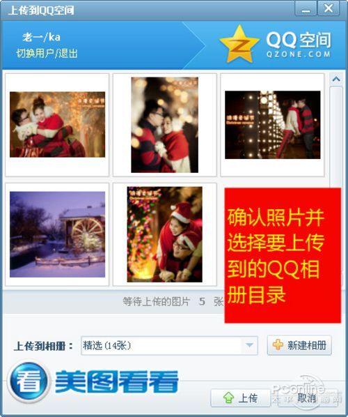 隨后,美圖看看會引導(dǎo)用戶以自己的QQ號碼登陸到QQ空間;完成登陸后即會進(jìn)入上傳到QQ空間的操作窗口,如下圖所示。在這里確認(rèn)好要上傳的照片,選擇好QQ空間的相冊目錄,單擊“上傳”按鈕就搞定啦!