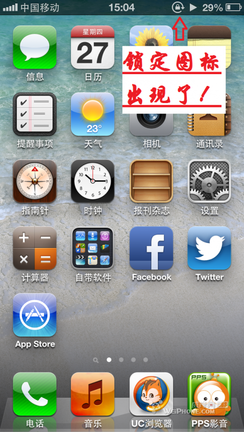 最后,大家就會(huì)發(fā)現(xiàn)小蘋果的屏幕上出現(xiàn)了一個(gè)鎖屏的圖標(biāo)哦,如下圖箭頭所指: