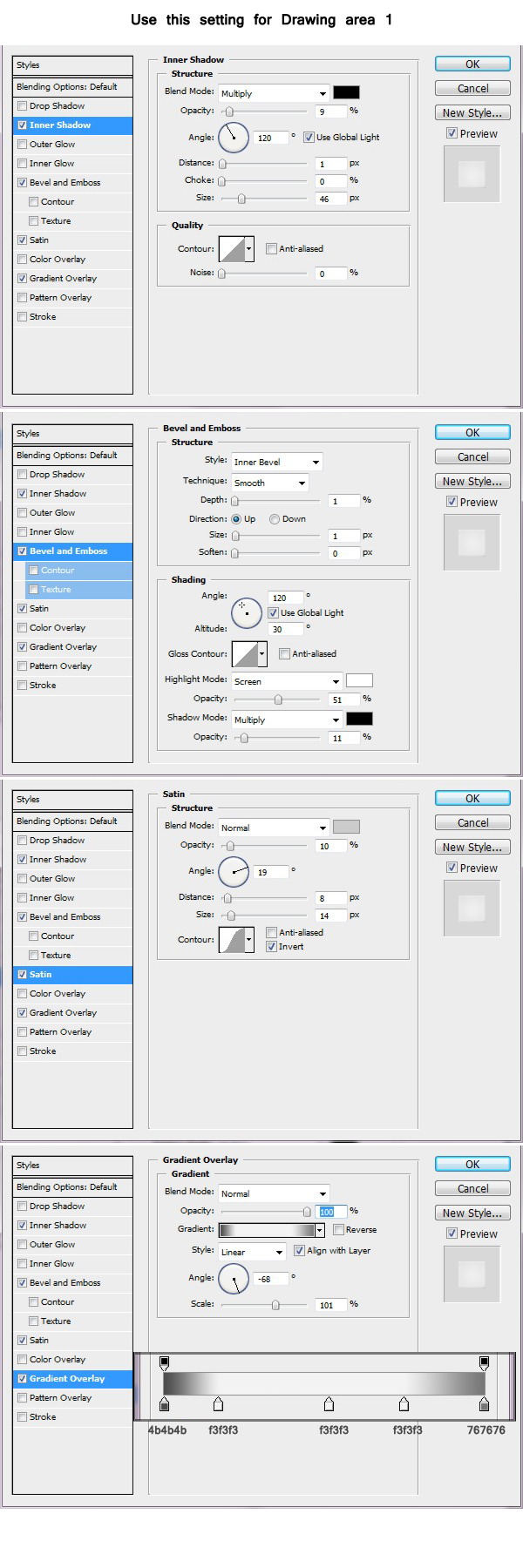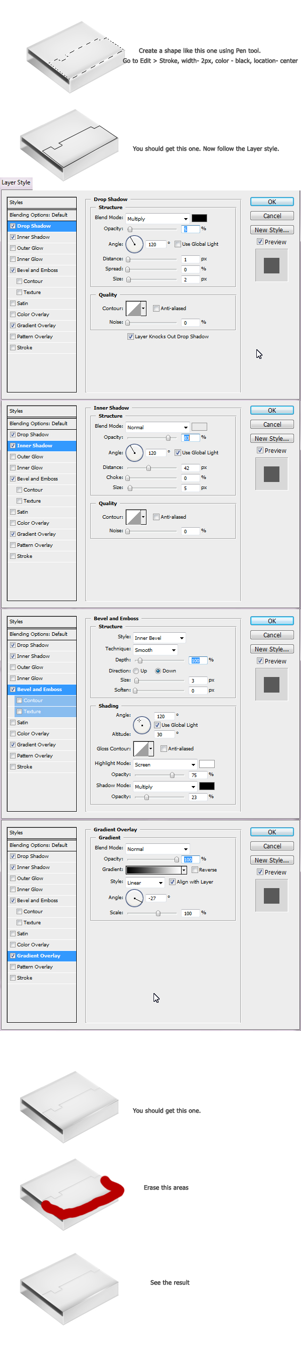 復(fù)制此圖層樣式應(yīng)用到其他3個(gè)繪圖層。對(duì)于每一層,你將需要改變漸變疊加的角度,形狀2,使用-59度的角度,3和4的形狀,使用的角度為-51度。完成的效果如下。