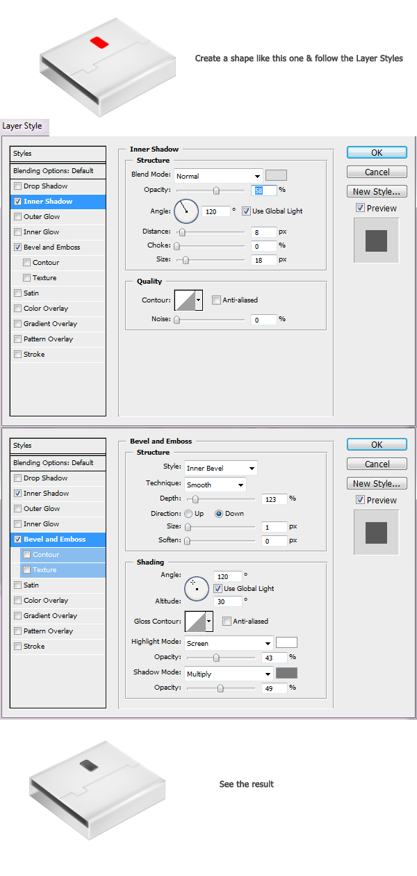 CMD +單擊我們剛剛創(chuàng)建的圖層縮覽圖。創(chuàng)建一個(gè)新層,去選擇>修改>收縮,由1px的合同。白色填充它。現(xiàn)在,按照?qǐng)D層樣式。請(qǐng)參閱下面的圖片。