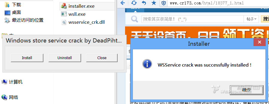 3、安64位的請運行wscrack_64中的install.exe,32位系統(tǒng)請運行wscrack_32中的install.exe,在彈出的對話框中選install,安裝服務(wù),成攻提示如圖: