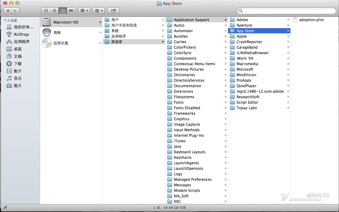 步驟2:打開Finder (在電腦的左下角)后快捷鍵 “shift + command + c" ,選擇“ macintosh HD " 這個(gè)硬盤后選擇“ 資源庫 ”后繼續(xù)選第一個(gè)“application support"里面有個(gè)"app store"的文件夾,里面會(huì)有個(gè)“adoption.pllst"的文件。不用懷疑,直接把這個(gè)文件刪除掉。(具體路徑見下圖,關(guān)于有fy擔(dān)心刪除這個(gè)文件會(huì)不會(huì)有影響,這點(diǎn)不用擔(dān)心,在我更新完iphoto后發(fā)現(xiàn)這個(gè)文件又出來了,估計(jì)這個(gè)文件只是一個(gè)保存登陸過的帳戶信息而已,況且此解決辦法是蘋果400的技術(shù)人員提供給我的,所以刪除掉不會(huì)有副作用的)