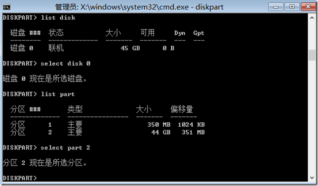 select disk 0 (這里只有一塊磁盤,由于是在虛擬機里,沒插u盤,直接連的iso文件,實際環(huán)境中至少有兩塊盤)