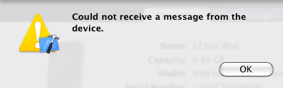 2.插入iPod,彈出“Could not receive a message from the device.”警告消息框如下:
