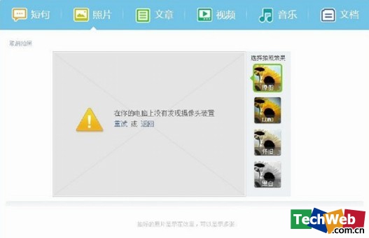 “推他”的照片發(fā)布支持用戶直接使用攝像頭進(jìn)行拍照,并且可以對(duì)照片進(jìn)行3種效果(LOMO、懷舊、黑白)的處理。