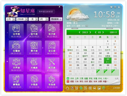 我們可以看到在人生日歷界面的下方有一排設(shè)計有萌點的功能按鈕,除了生活中常用到的記事提醒、節(jié)假日安排、預(yù)訂火車票等日常功能外,我們還看到一個星星圖案的圖標,這個按鈕代表的是什么功能呢?讓小編來為你揭曉!點擊按鈕,在日歷的左側(cè)出現(xiàn)了人生日歷的星座查詢功能——知星座。神秘的紫色背景,把我們帶入了一個屬于星星的未知世界,在這里我們可以便捷的查詢到12星座的運勢,配對,以及各類星座相關(guān)的資訊,還有不少有趣的小測試,忙碌之余查查星座玩玩小測試也不失為一種很好的放松方式。