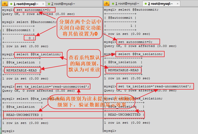 首先,修改兩個會話中的自動提交功能,將其關(guān)閉,然后修改系統(tǒng)默認(rèn)的隔離級別,從低級別開始,將默認(rèn)的可重讀改為讀未提交。