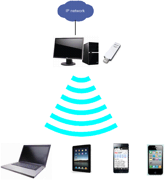在沒有無線路由器的情況下,電腦通過有線連接到寬帶線路已經(jīng)可以上網(wǎng)。電腦上安裝具有模擬AP功能的無線網(wǎng)卡,并設(shè)置共享可以訪問互聯(lián)網(wǎng)的網(wǎng)絡(luò)連接,模擬AP與可以訪問互聯(lián)網(wǎng)的網(wǎng)絡(luò)連接就虛擬出一個(gè)“無線路由器”。其他的無線設(shè)備如筆記本、手機(jī)、PAD等就可以無線連接上模擬AP共享上網(wǎng)了。