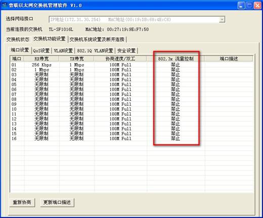 3. 為了正常的使用端口帶寬限制功能,建議將交換機(jī)所有端口的802.3x流量控制功能禁止: