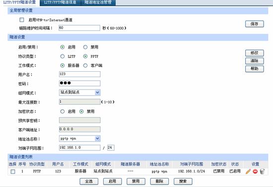 3. 客戶端和服務(wù)器端條目建立后,都選擇啟用,成功建立后在服務(wù)器端和客戶端的L2TP/PPTP隧道信息中將有條目: