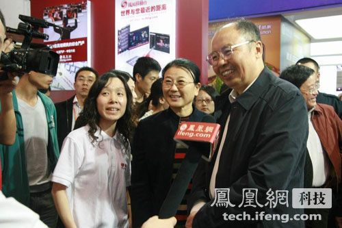 人民日?qǐng)?bào)社社長(zhǎng)張研農(nóng)、副總編輯馬利、人民搜索總裁鄧亞萍在鳳凰網(wǎng)展臺(tái)前,駐足觀看鳳凰網(wǎng)科技策劃的“最老總”、“最手機(jī)”、“最公司”互動(dòng)投票。