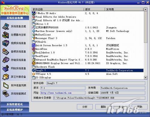 使用電腦一段時(shí)間后,你的電腦中就會(huì)在不知不覺(jué)中安裝許多軟件,究竟安裝了哪些軟件呢?只要點(diǎn)擊“軟件信息列表”就可以輕松的看到電腦中安裝的所有軟件,同時(shí)點(diǎn)擊列表中的一個(gè)軟件名稱(chēng),就可以在下面看到軟件的版本號(hào)、發(fā)布商、安裝日期以及