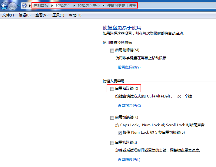 2, 進入控制面板——輕松訪問,點擊【輕松訪問中心】里面的【更改鍵盤工作方式】,把中間的【啟用切換鍵】前面的勾選去掉,然后保存。