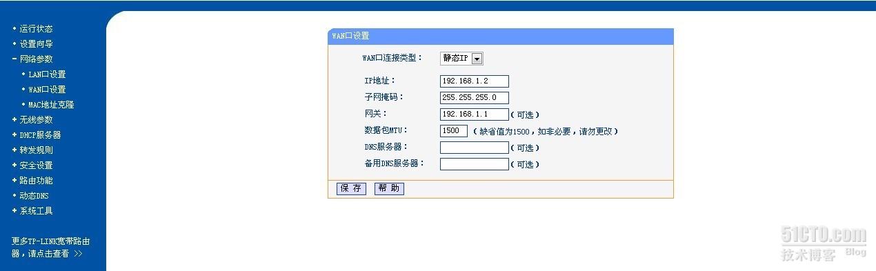 選擇”網(wǎng)絡(luò)參數(shù)”-“WAN接口設(shè)置”-“WAN口連接類(lèi)型”,我們選擇”靜太I(xiàn)P”。IP地址改為:192.168.1.2,子網(wǎng)掩碼:255.255.255.0,網(wǎng)關(guān):192.168.1.1。