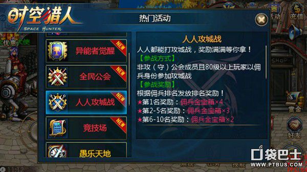 空前規(guī)模的時空獵人攻城戰(zhàn)新玩法上線,全民參軍,舉國攻城!現(xiàn)在只要滿80等級,玩家即可以“傭兵”身份參與攻城戰(zhàn),再無公會、戰(zhàn)力等限制,讓你體驗戰(zhàn)爭中身先士卒的豪邁感,贏得豐厚傭兵獎賞!