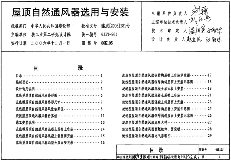 圖集中包括流線型和旋流型屋頂自然通風器的設(shè)計選用說明、外形尺寸圖、風量估算表及其在混凝土屋脊、屋面板、斜屋面和鋼結(jié)構(gòu)屋脊、屋面上的安裝。