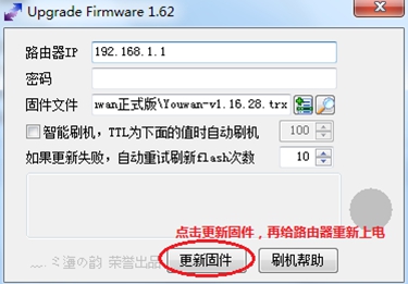 點(diǎn)擊TFTP工具中“更新固件”按鈕,再將路由電源重新上電,(只要確定ping通后 就可以拔掉電源,點(diǎn)擊更新馬上插上電源)
