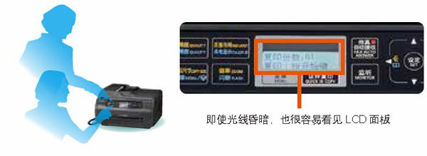 無論您是站著還是坐著,傾斜式控制面板設計都令操作更為便利。因此該系列多功能一體機放在擱板或架子上時也能輕松進行操作。由于是LCD背光設計,所以方便用戶清晰查看。