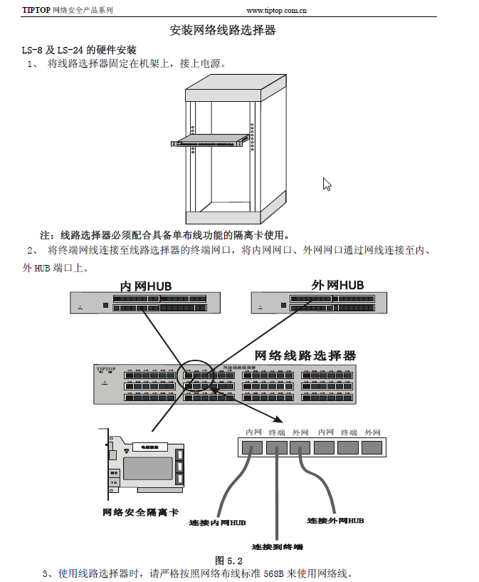 2、隔離卡安裝說(shuō)明中包括:IP切換設(shè)置方法,單硬盤(pán)、雙硬盤(pán)、三硬盤(pán)安裝說(shuō)明和線路選擇器手冊(cè)。