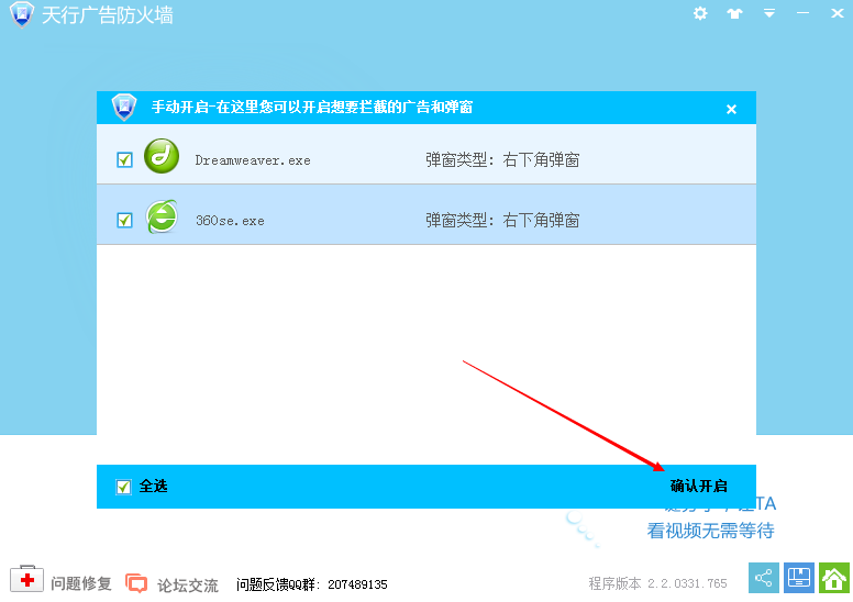 使用天行廣告防火墻廣告攔截軟件,如果你不想對某網(wǎng)站進行彈窗攔截的話,可嘗試點擊“彈窗攔截”按鈕,并點擊“確認開啟“,如下圖所示: