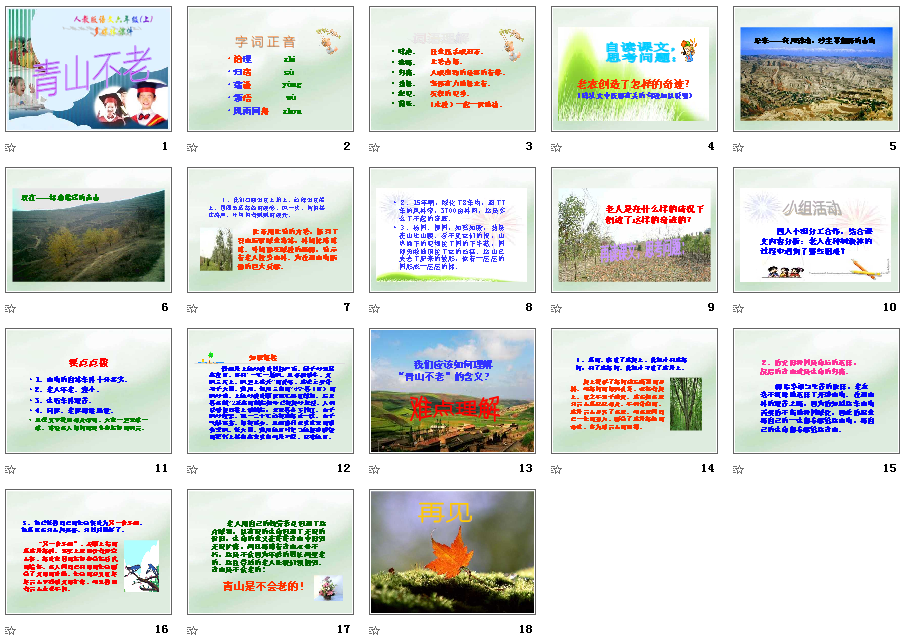 《青山不老》講訴的是一位老人用15年的時(shí)間,在惡劣的自然條件和生活條件下在晉西北奇跡般地創(chuàng)造了一片綠洲,這是人教版語文六年級(jí)上冊(cè)第四單元第16課的略讀課文,這里帶來的是青山不老ppt課件,大家可以免費(fèi)下載青山不老ppt教學(xué)使用。