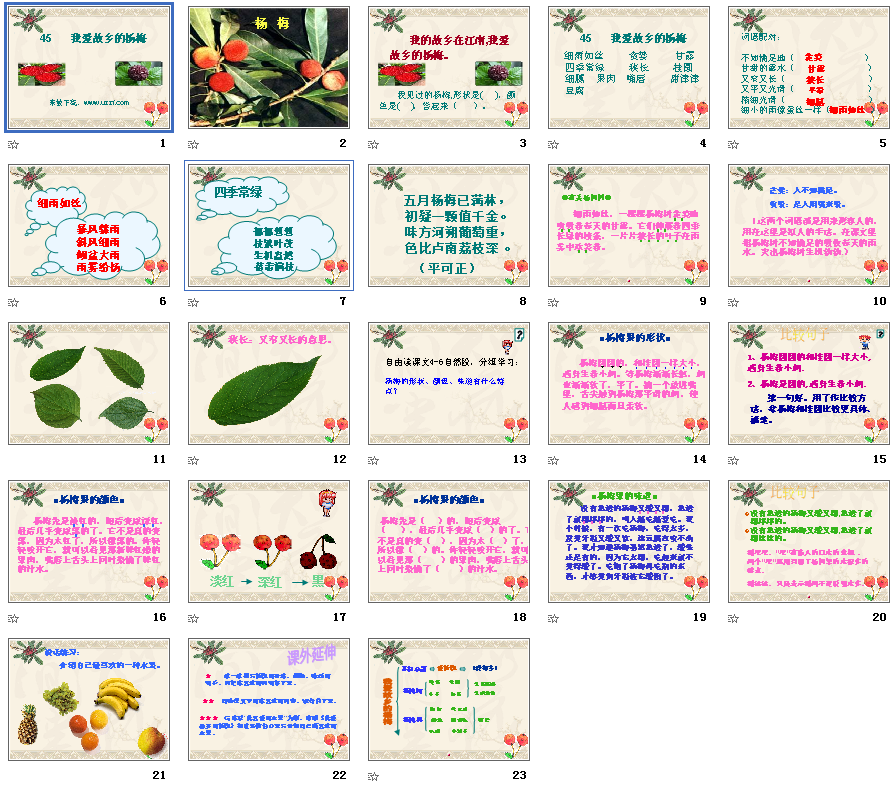 《我愛故鄉(xiāng)的楊梅》是一篇選修課文,描述了故鄉(xiāng)楊梅樹的美麗及楊梅果的可愛,表達作者熱愛故鄉(xiāng)的思想感情。作者通過由整體到部分、由表及里的順序及“眼看、手摸、嘴嘗”的方法進行觀察,采用了細膩的描寫手法進行敘述,使讀者對楊梅產(chǎn)生了如見其形、如觀其色、如品其味的感覺。下面帶來的是人教版小學語文三年級下冊我愛故鄉(xiāng)的楊梅ppt課件,需要的朋友可以免費下載我愛故鄉(xiāng)的楊梅ppt教學使用。