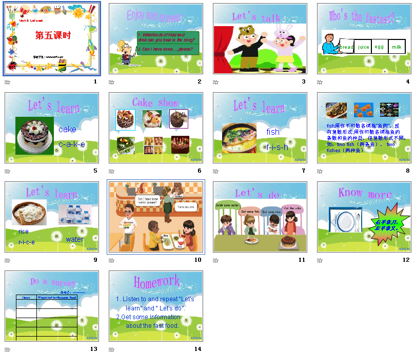 unit5 let's eat第五課時(shí)主要學(xué)習(xí)認(rèn)讀water, cake, fish,rice 這些單詞。要求學(xué)生能聽懂、辨認(rèn)圖片中所學(xué)的食物及書寫形式。下面帶來的是人教版小學(xué)英語三年級(jí)上冊(cè)unit5 let's eat第五課時(shí)ppt課件以及教學(xué)反思,大家可以免費(fèi)下載unit5 let's eat第五課時(shí)ppt教學(xué)使用。