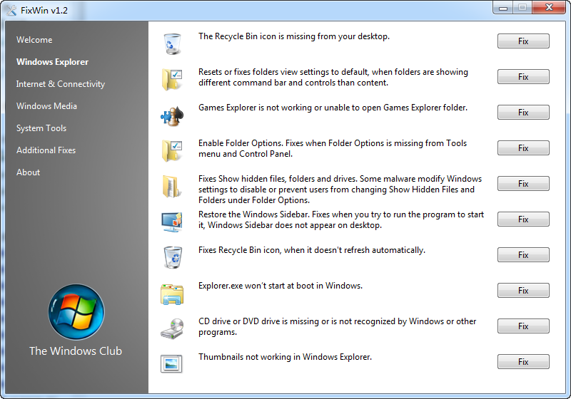 fixwin是一款小巧但功能非常強(qiáng)大的windows系統(tǒng)修復(fù)工具,電腦上的所有系統(tǒng)常見錯誤它都能幫你修復(fù),例如圖標(biāo)不見了,文件打不開,或者光驅(qū)無法識別等等問題。有需要的快拿走吧。