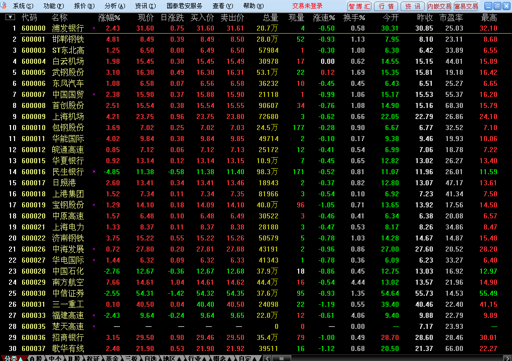 【菜單欄】位于系統(tǒng)畫面左上方,包括系統(tǒng)、功能、報價、分析、資訊、查看、幫助等六個欄目。同時按下Alt和菜單旁的字母即可選中彈出下拉列表,按下相應(yīng)的字母鍵選中功能。