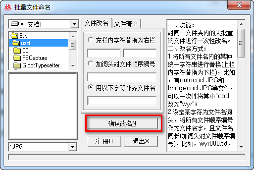 1.將所有文件名內(nèi)的某種統(tǒng)一字符串進(jìn)行替換(上欄內(nèi)字符替換為下欄),比如,有autocad.JPG和Imagecad.JPG等文件,可以一次性將其中"cad"改為"wyr";