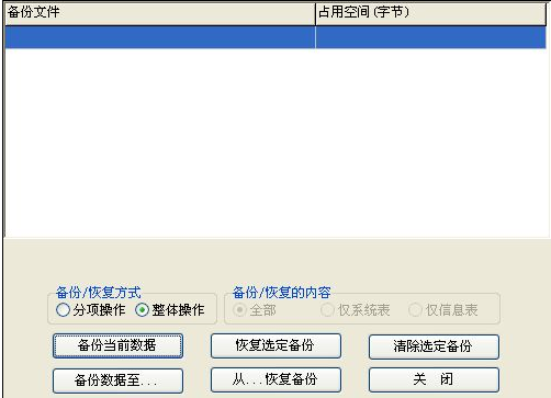 恢復選定備份按鈕:將備份列表中選定的備份文件恢復到當前系統(tǒng)中,如果當前系統(tǒng)中有備份后新增加的數(shù)據(jù),將會丟失。
