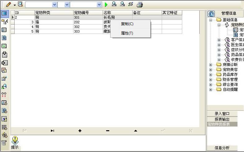 寵物種類,客戶登記,醫(yī)生信息,癥狀分析,藥品信息,收費價目表,方便您查詢各種基本信息。