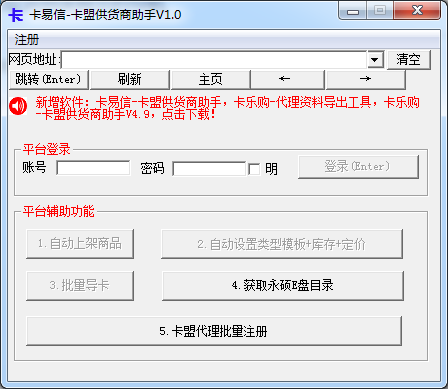 卡易信卡盟供貨商助手可以進(jìn)行一鍵上架商品,一鍵設(shè)置模板和庫存和定價,并且支持秒速導(dǎo)卡,一個商品的1000張卡密只需要2秒即可導(dǎo)入,并且支持永碩E盤目錄批量獲取,支持卡易信卡盟代理批量注冊。