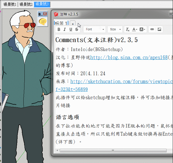 Comments是一款功能強大的sketchup文本注釋插件,它能給SketchUp添加詳細的注釋內(nèi)容,方便用戶解讀,東坡小編帶來的是Comments官方最新版,你還可利用它添加鏈接及網(wǎng)絡圖片鏈接,有需要的朋友歡迎下載!
