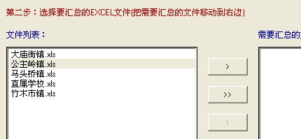 4、點(diǎn)擊以下“>”或“《”按鈕,會(huì)將左邊的表格移動(dòng)到右邊“需要匯總的文件”中,默認(rèn)第一行為審核標(biāo)準(zhǔn)文件