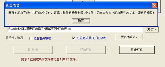 6、點(diǎn)擊“開(kāi)始匯總”進(jìn)行表格匯總,軟件自動(dòng)進(jìn)行匯總,完成后會(huì)出現(xiàn)以下提示框,點(diǎn)擊“確定”即可,點(diǎn)擊 “關(guān)閉”按鈕退出軟件,如需匯總完成后查看匯總表,可勾選“匯總完成后打開(kāi)匯總表”