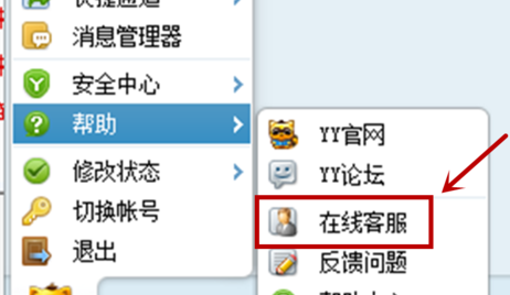 點擊yy左下角菜單,選擇幫助,點擊在線客服