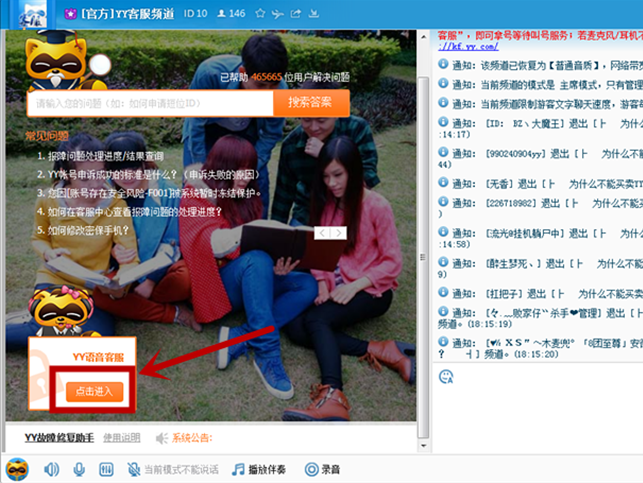 在頻道左下角點擊yy語音客服進入,訴說舉報內(nèi)容