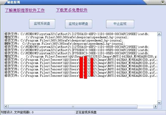 能監(jiān)視磁盤中創(chuàng)建、修改、刪除文件的的操作?蛇\用于查看瀏覽器下載的音樂、視頻緩存位置,也能監(jiān)視安裝程序在什么地方創(chuàng)建過文件。在監(jiān)視時運行一些軟件,可以用于判斷這個軟件生成哪些文件,是否有生成木馬的跡象。
